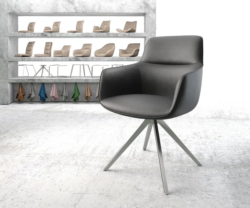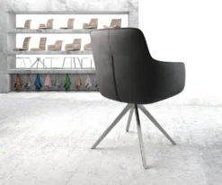 Die Sitzschale Pejo ist durch ihr klassisches Design mit durchgehenden Armlehnen ganz besonders bequem. Die hochwertige Ziernaht an der Rückenlehne macht sie zu einem edlen Hingucker.Das hochwertige Echtleder in klassischem Schwarz begeistert durch eine besonders angenehme Geschmeidigkeit und einer außergewöhnlichen Robustheit. Esszimmerstuhl Pejo Echt-Leder Schwarz – die perfekte SitzgelegenheitDas Stuhlgestell mit Rückholfunktion verfügt über eine auffällige Kreuzform und lässt sich bequem bis zu 180 Grad drehen.Das Stuhlgestell wurde aus hochwertigem, handgebürstetem Edelstahl hergestellt. Durch das Bürstenverfahren glänzt das Gestell in edler Optik und ist besonders widerstandsfähig gegen Rost und Verschleiß.