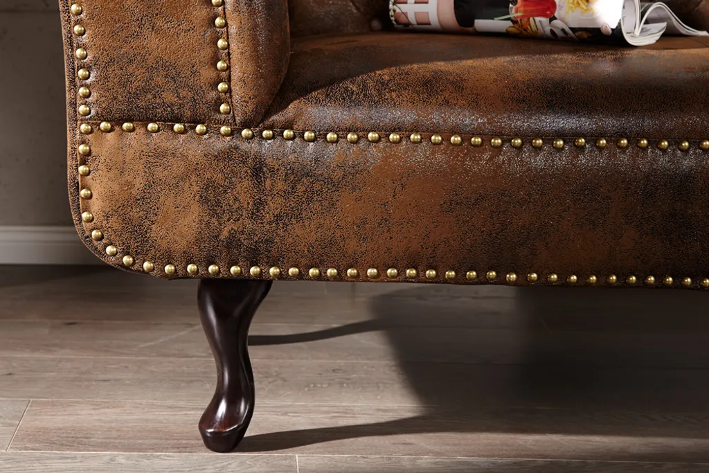 Diese klassische Chesterfield Recamiere / Chaise Lounge wird Sie begeistern! Hergestellt aus hochwertigem Polyester in coffee. Typisch für diese Recamiere ist die gebogenen Armlehne, die mit Knöpfen verzierte Lehnenfläche, sowie der Nietenbesatz und die wunderschönen, dunklen, geschwungenen Beine. Besonders bequem aufgrund der sehr großzügigen Polsterung! Ein Highlight in Ihrem Ambiente und für Liebhaber des englischen Stils! Materialzusammensetzung des Bezugsstoffes: Oberfläche 100% Polyester (Microfaser)
