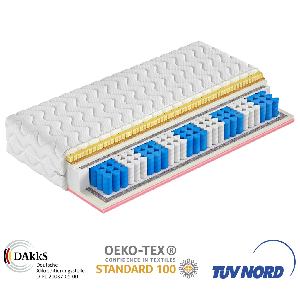 Komfort – durch die Verwendung der Taschenfedertechnologie (262 Stück / m2) ist die Matratze in 7 Zonen unterteilt, von denen jede eine entsprechende Unterstützung für den Körperteil hat.