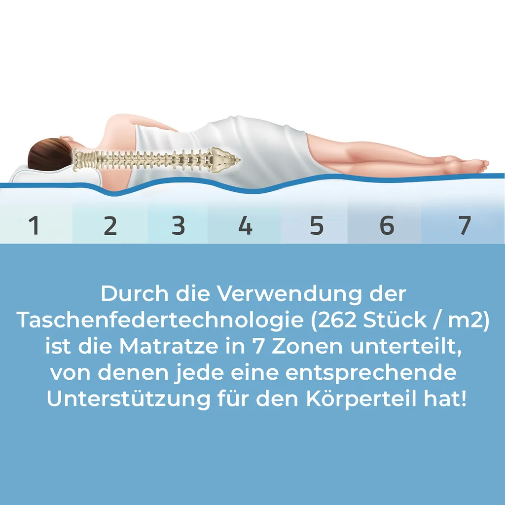 Komfort – durch die Verwendung der Taschenfedertechnologie (262 Stück / m2) ist die Matratze in 7 Zonen unterteilt, von denen jede eine entsprechende Unterstützung für den Körperteil hat.