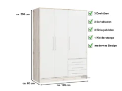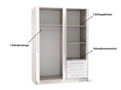 Die Front erstrahlt in einem einheitlichen und neutralen weißen Farbton, während sich der Korpus bewusst modern in einem Sandeiche Nachbildung zeigt. Die alufarbenen Griffe setzen hierbei gekonnt gewisse Akzente und komplementieren den Look. Auf einer gesamten Breite von ca. 145 cm erwarten Sie insgesamt 3 Einlegeböden, 1 Kleiderstange sowie 3 Schubkästen.