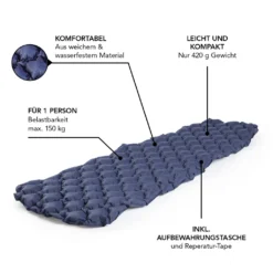 Die 420 g leichte Matte ist innerhalb kurzer Zeit aufgepumpt oder aufgeblasen und sorgt so für mehr Bequemlichkeit auch auf harten Untergründen. Sie besteht aus robustem und wasserfestem Material und ist damit sowohl strapazierfähig als auch komfortabel. Die spezielle Form der aufblasbaren Campingmatte von EASYmaxx spart zudem Platz.
