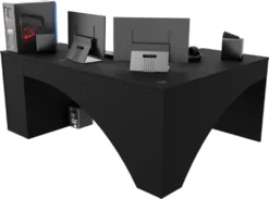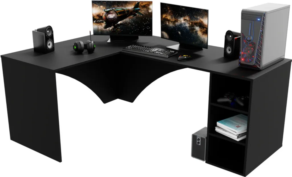 Gaming-Ecktisch CARAMBOL.Er besticht durch sein schlichtes, modernes Design. Er besteht aus Laminat mit ABS-Kanten. Die Kanten schützen den Tisch vor mechanischer Beschädigung und Feuchtigkeit. Er hat eine große Ablagefläche, unter der sich Stauraum in Form von drei offenen Regalen befindet. Sie können aus mehrerenNachbildungen wählen. Es gibt auch eine Option mit LED-Beleuchtung.