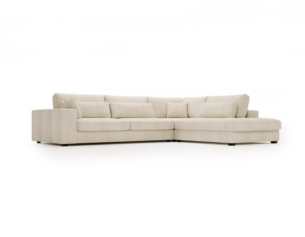 Die elegante Eckgarnitur mit weichem Textilbezug und Kord-Optik bietet aufgrund der Nosagunterfederung und hochwertige Schaumpolsterung einen hervorragenden Sitzkomfort.