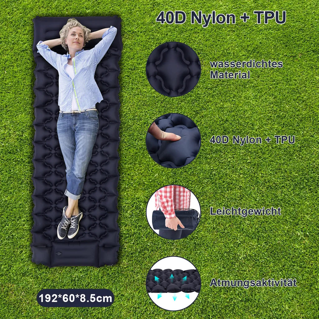 Hochwertige Materialien:Schwerlast-Ripstop, Dicht & Wasserundurchlaessig & Rustschfest.Hergestellt aus fortschrittlichem Hochleistungs-Nylon in Camping-Qualität, das keine Luftlecks zulässt, und wasserdichter TPU-Schicht. Diese Rucksackmatte