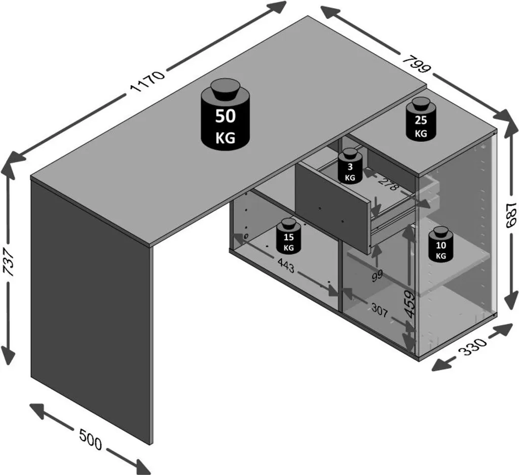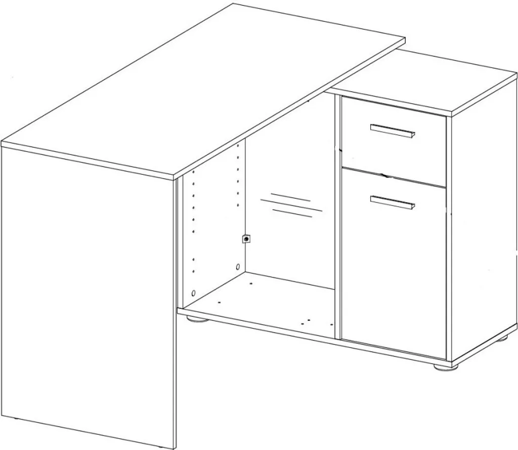 – 2 offene Fächer, 1 Schubkasten auf Metallauszügen, 1 Tür