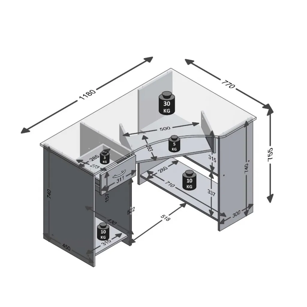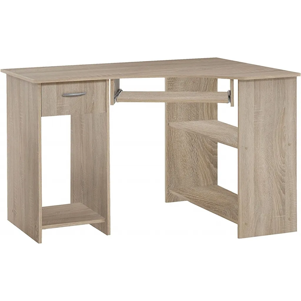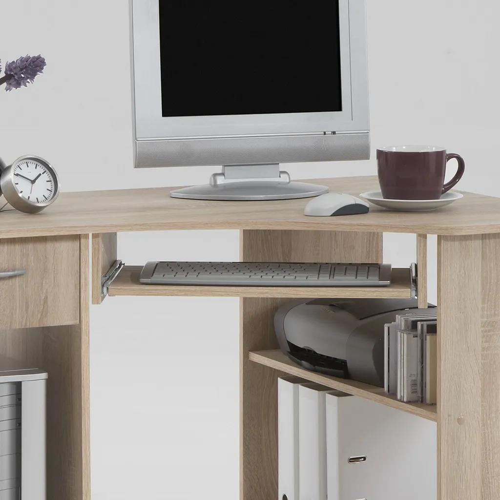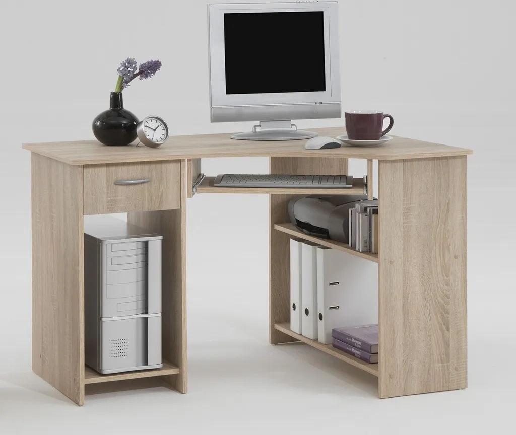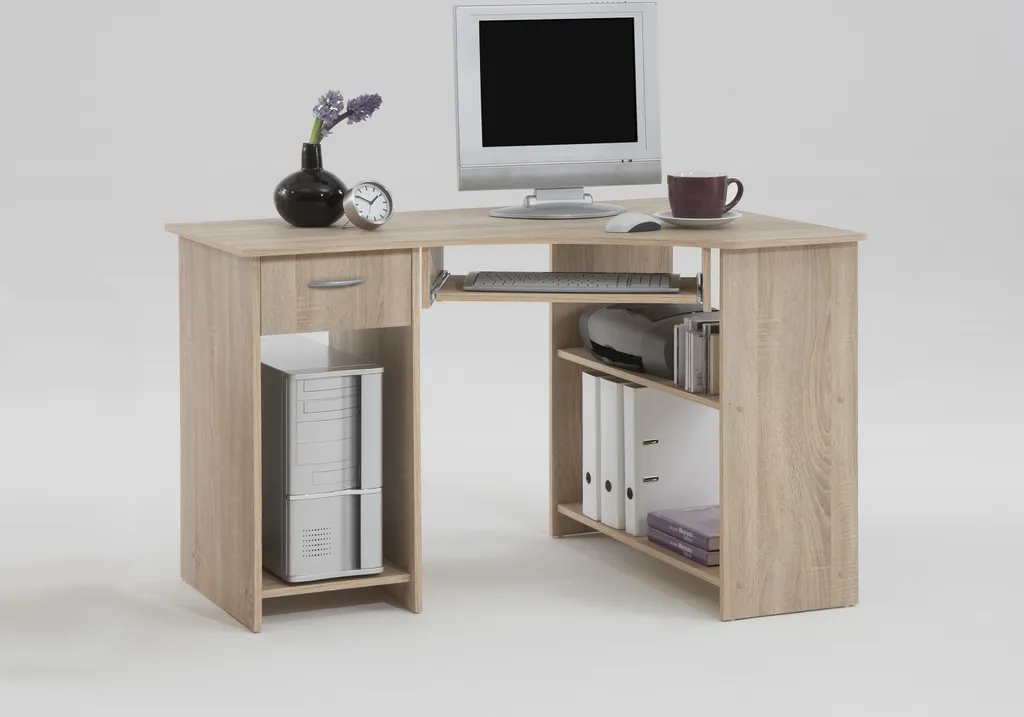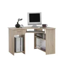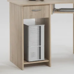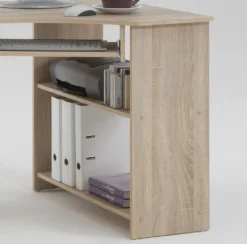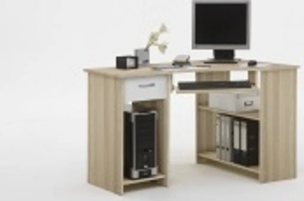 Der Computertisch mit einer pflegeleichten, melaminbeschichteten Kunststoffoberfläche in Eiche Nachbildung bietet auf der linken Seite mit einer Schublade und einem offenen Fach Platz für den PC-Tower sowie Schreibutensilien. Auf der rechten Seite können der Drucker, Ordner und CD´s in einem Regalelement untergebracht werden. So haben Sie alles schnell zur Hand. Der Tastaturauszug lässt Ihre Tastatur bei Nichtgebrauch platzsparend unter dem Tisch verschwinden. Der Schreibtisch ist sowohl frei in den Raum stellbar, kann aber idealerweise auch als Eckschreibtisch genutzt werden.