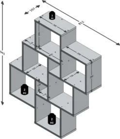 Dieses Wandregal von FMD ist ein modernes Hängeregal, bestehend aus 6 großen und 2 kleineren Fächern, die in einem spielerischen Muster angeordnet wurden.