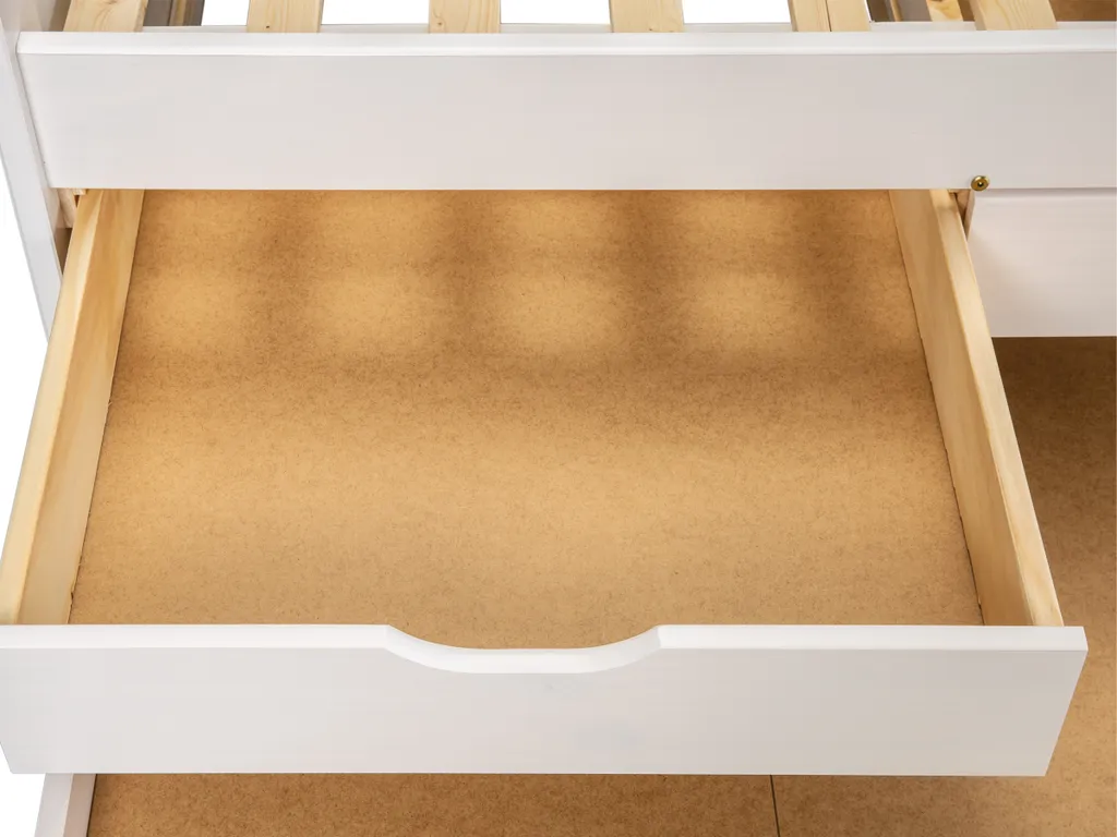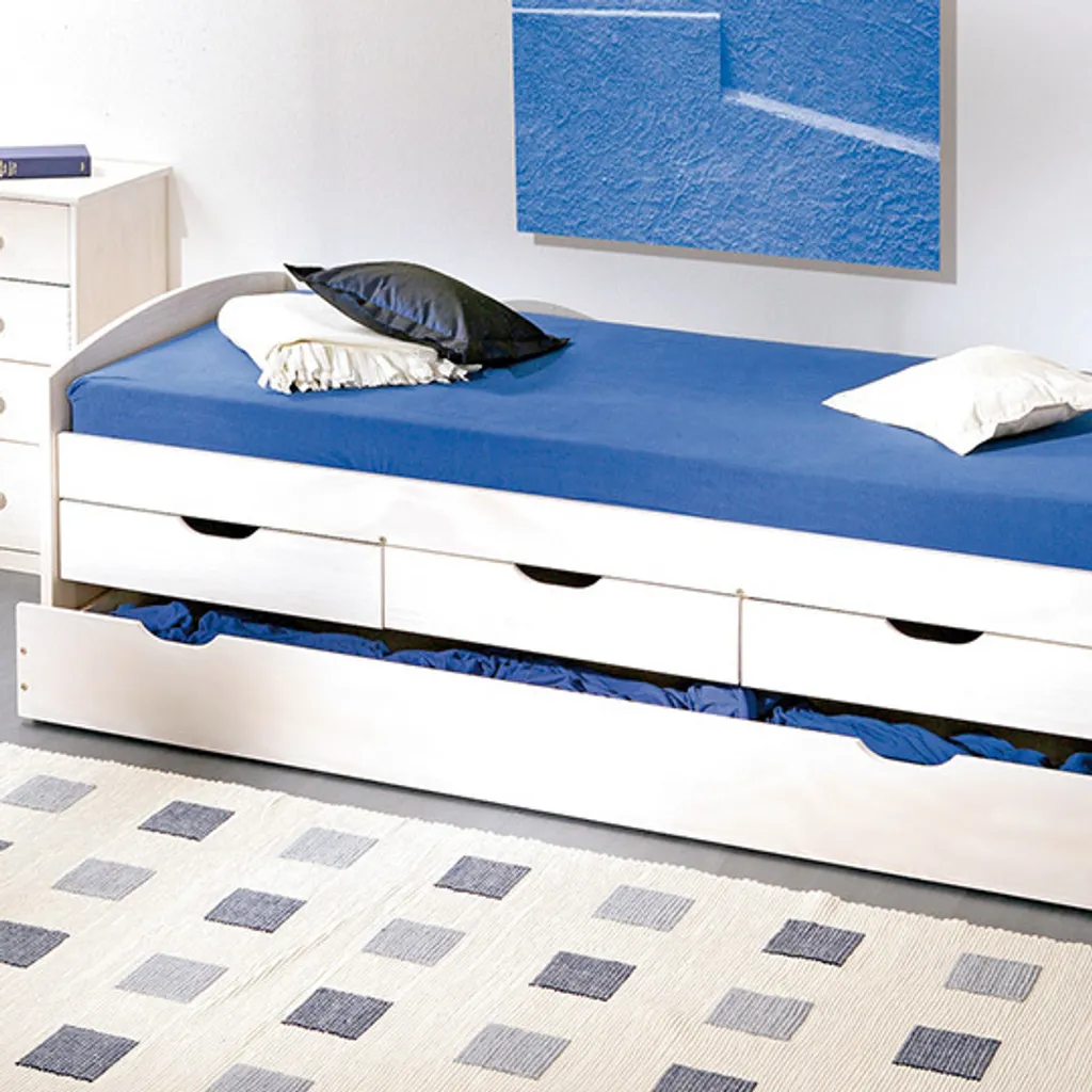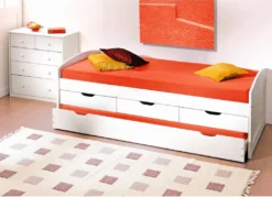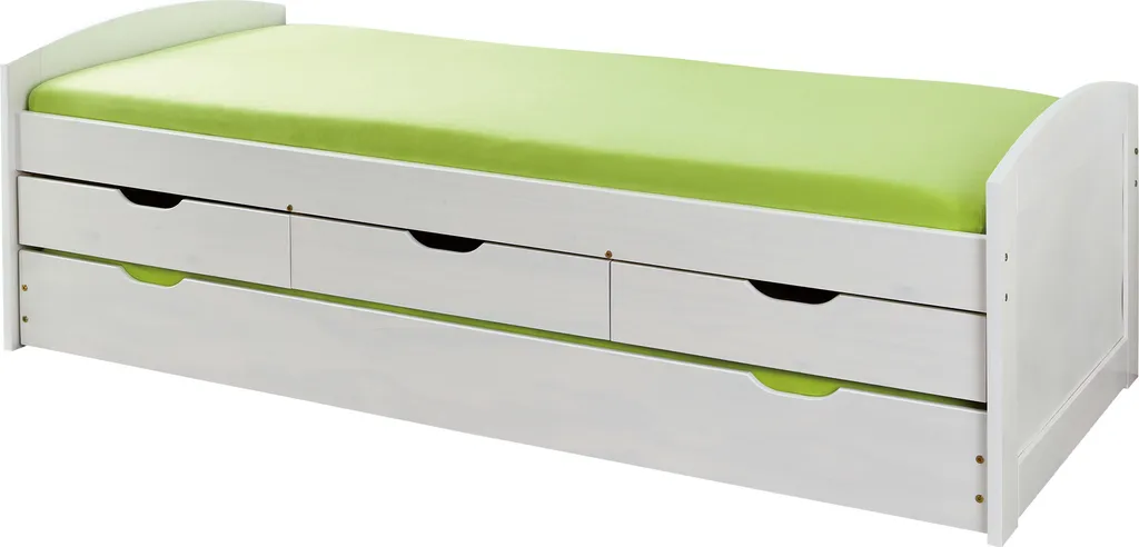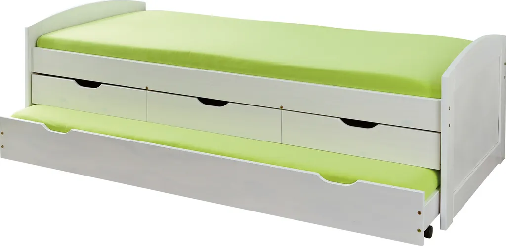 Ob Gäste- oder im Kinderzimmer dieses Funktionsbett bietet durch eine zusätzliche Gästeliege viele Platzvorteile. Es ist ein äußerst praktisches massivholz Funktionsbett denn der Platz unter dem Bett wird durch ein Schubladensystem effizient genutzt. Das Bett verfügt über 3 Schubladen. Bettbezüge, Decken oder andere Utensilien können direkt unter dem Bett verstaut werden. Der widerstandsfähige weiße Lack ist wasserabweisend und besonders pflegeleicht. Durch die weiße Farbe scheint die natürliche Holzmaserung leicht hindurch. Dadurch kommt der Kiefernholz-Charakter einzigartig zur Geltung. Das verwendete Material (Massivholz) erfüllt neuste Qualitätsstandards. Nur durch die Verwendung von ausgewählten Materialien, entsteht ein robustes und stabiles Bett. Das Bett ist ein Platzwunder und überzeugt neben dem Platzvorteil durch eine hohe Beständigkeit. Bei Bedarf entsteht auf kleinstem Raum eine zusätzliche Gästeliege. Ulli kann bequem als Sofa genutzt werden. Lattenrost enthalten: Ja. Aufgebaute Maße (BxTxH):98 x 205 x 63 cm.