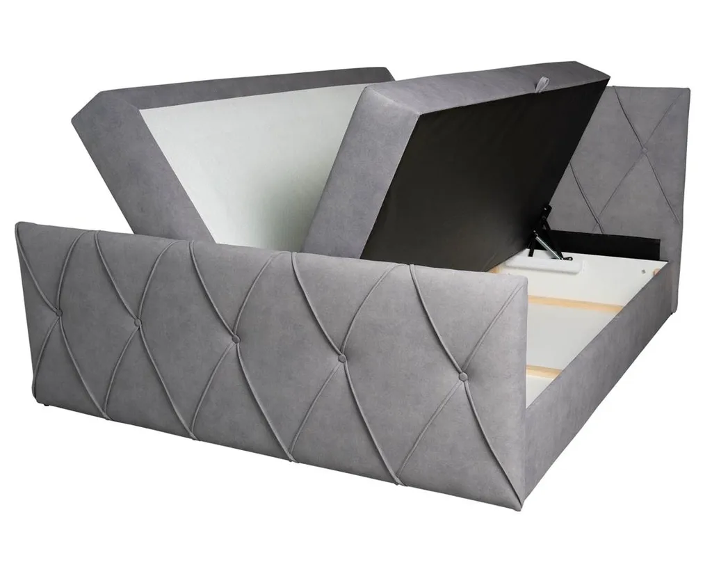 Das gepolsterte, große Boxspringbett ist für 2 Personen geeignet. Die zwei praktischen Bettkästen werden mithilfe eines voneinander unabhängigen, automatischen Hebesystems mit Federn angehoben. Jeder Bettkasten bietet viel Stauraum, was für Ordnung sorgt und hilft, die Bettwäsche, Kissen oder Decken knitterfrei aufzubewahren.