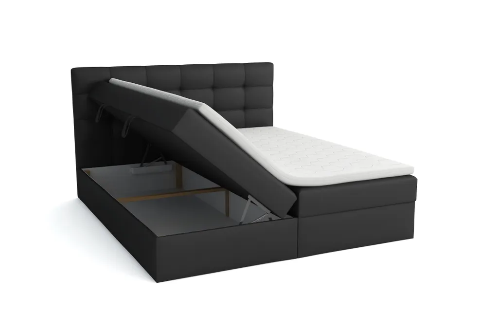 Das gepolsterte, große Boxspringbett ist für 2 Personen geeignet. Die zwei praktischen Bettkästen werden mithilfe eines voneinander unabhängigen, automatischen Hebesystems mit Gasdruckfedern angehoben. Jeder Bettkasten ist innen in 2 Kammern unterteilt, was für Ordnung sorgt und hilft, die Bettwäsche, Kissen oder Decken knitterfrei aufzubewahren.