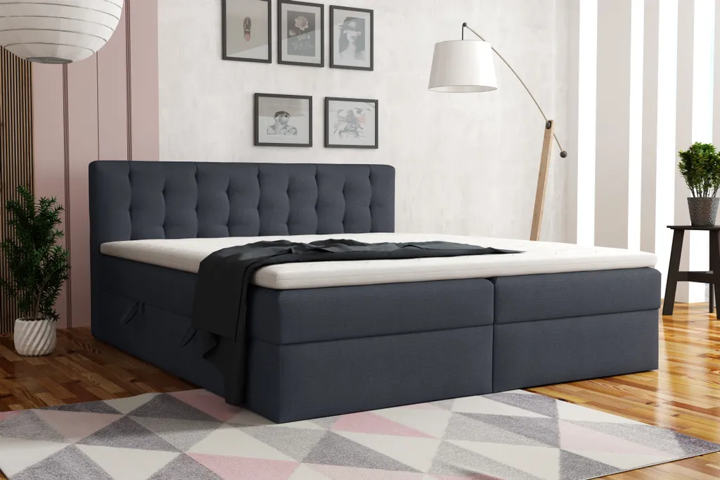 Das gepolsterte, große Boxspringbett ist für 2 Personen geeignet. Die zwei praktischen Bettkästen werden mithilfe eines voneinander unabhängigen, automatischen Hebesystems mit Gasdruckfedern angehoben. Jeder Bettkasten ist innen in 2 Kammern unterteilt, was für Ordnung sorgt und hilft, die Bettwäsche, Kissen oder Decken knitterfrei aufzubewahren.