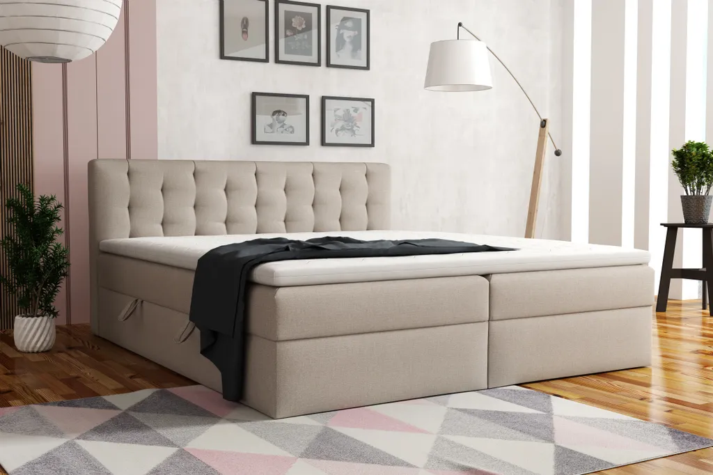 Das gepolsterte, große Boxspringbett ist für 2 Personen geeignet. Die zwei praktischen Bettkästen werden mithilfe eines voneinander unabhängigen, automatischen Hebesystems mit Gasdruckfedern angehoben. Jeder Bettkasten ist innen in 2 Kammern unterteilt, was für Ordnung sorgt und hilft, die Bettwäsche, Kissen oder Decken knitterfrei aufzubewahren.