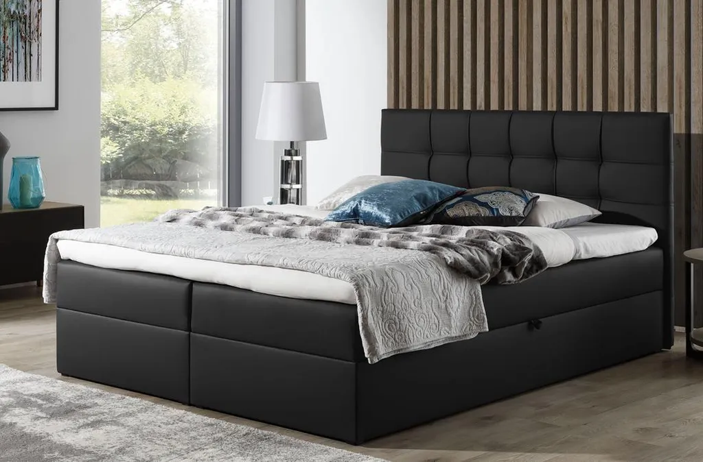 Das gepolsterte, große Boxspringbett ist für 2 Personen geeignet. Die zwei praktischen Bettkästen werden mithilfe eines voneinander unabhängigen, automatischen Hebesystems mit Federn angehoben. Jeder Bettkasten bietet viel Stauraum, was für Ordnung sorgt und hilft, die Bettwäsche, Kissen oder Decken knitterfrei aufzubewahren.