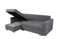 Für mehr Ordnung ist die elegante Polstercouch mit zwei praktischen Bettkästen zur Aufbewahrung von Bettwäsche, zusätzlicher Decken und Kissen ausgestattet. Dank der rückenechten Ausführung kann das Ecksofa frei im Raum stehen.