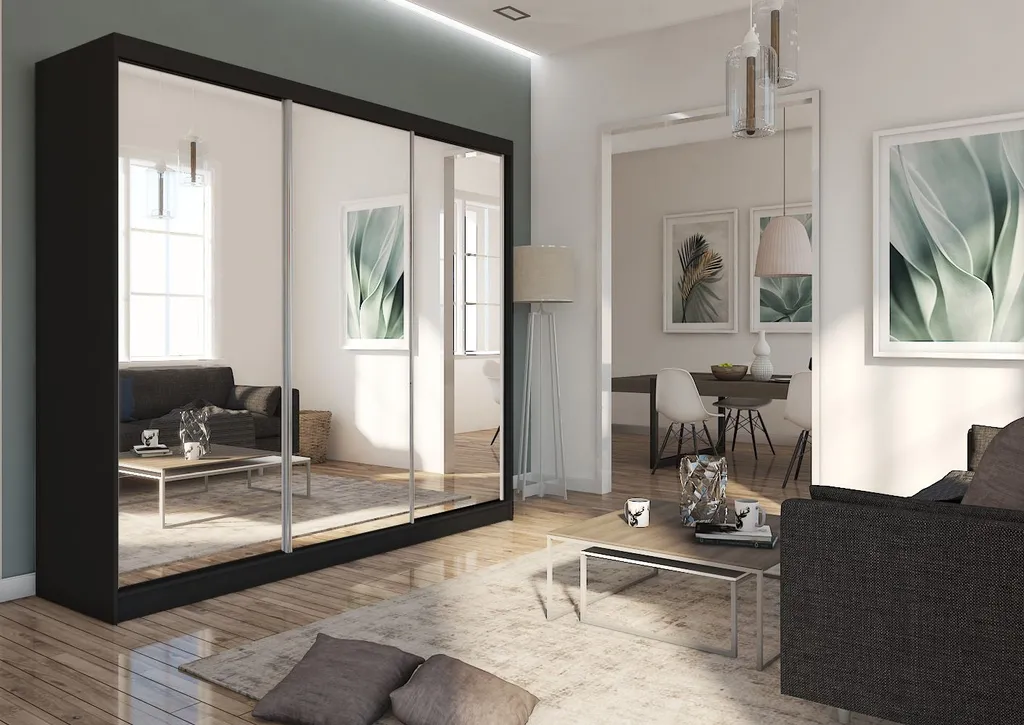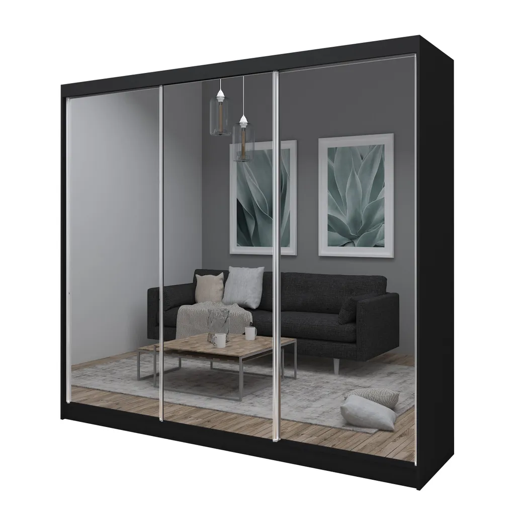 Der 240 cm breite Kleiderschrank mit 3 Schiebetüren eignet sich perfekt für all diejenigen, die etwas mehr Stauraum benötigen und an ständigen Mangel an Ablagemöglichkeiten leiden. Mit dem großzügigen Schrank bekommen Sie endlich ein Möbelstück, welches mit den Abmessungen von B240 x H 216 x T61 cm für ausreichend Aufbewahrungsmöglichkeiten und ein aufgeräumtes Ambiente in Ihrer Wohnung sorgt. Links- und rechtseitig befinden sich je vier große Fächer für Wäsche, Handtücher, Pullover, T-Shirts, Hosen oder andere Gegenstände. Oben sind drei weitere, breite Auflagen eingebaut, die eignet sich für Winterkleidung, Taschen, Bettwäsche oder andere sperrige Sachen, die nicht allzu oft benötigt werden, eignen. Mittig befindet sich zwei robuste Kleiderstange für Kleider, Blusen, Hemden, Jacken oder Mäntel.