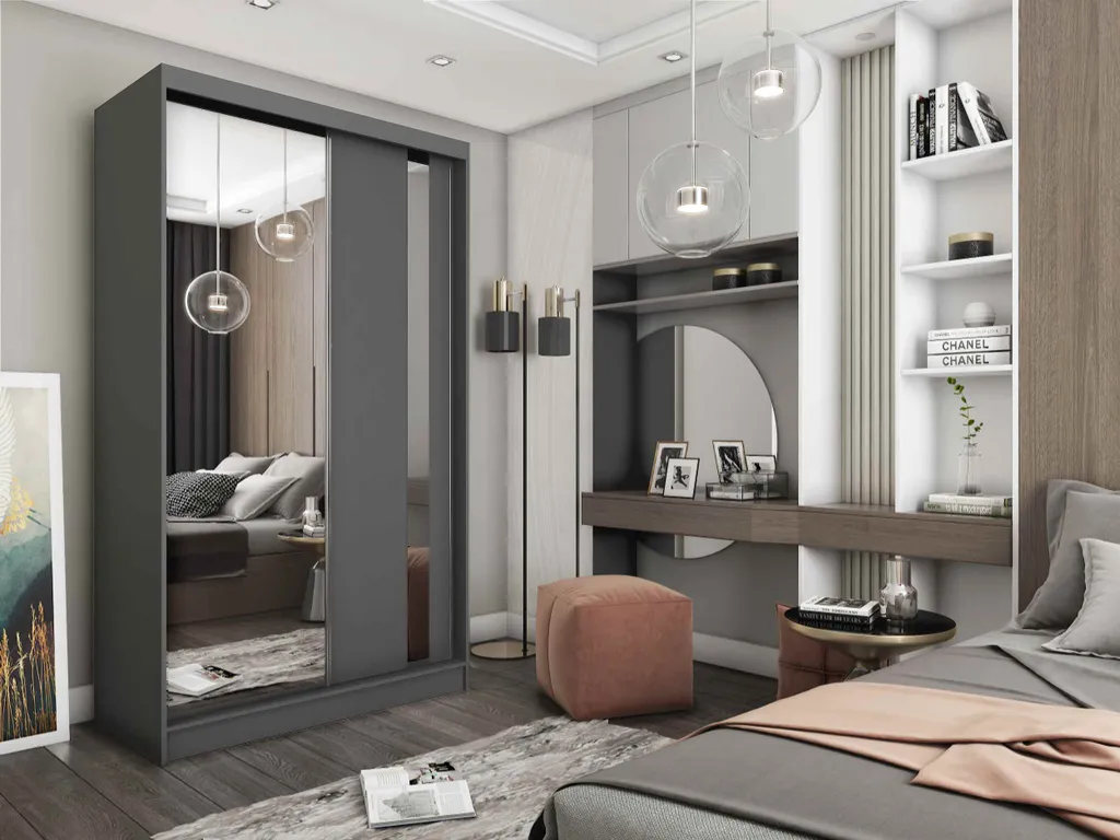 Dank der kompakten Abmessungen von B120 x H216 x T61 cm und der verspiegelten Tür ist der Kleiderschrank für Seniorenwohnungen, Single-Haushalte oder Studentenappartements ideal geeignet.