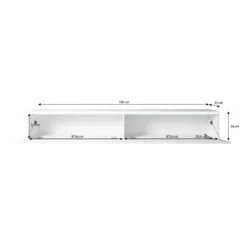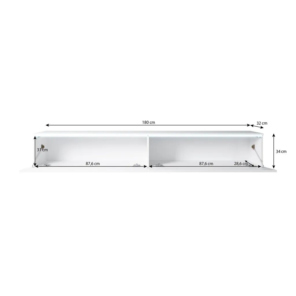 Viel Stauraum: Der TV-Schrank mit den Abmessungen B180 x H34 x T32 cm passt perfekt ins Wohnzimmer und bietet eine optimale Stellfläche für TV-Geräte. 2 Ablagen (je B87,6 x H31 x T28,6 cm) mit einer „Push-Click“-Tür bieten viel Stauraum.