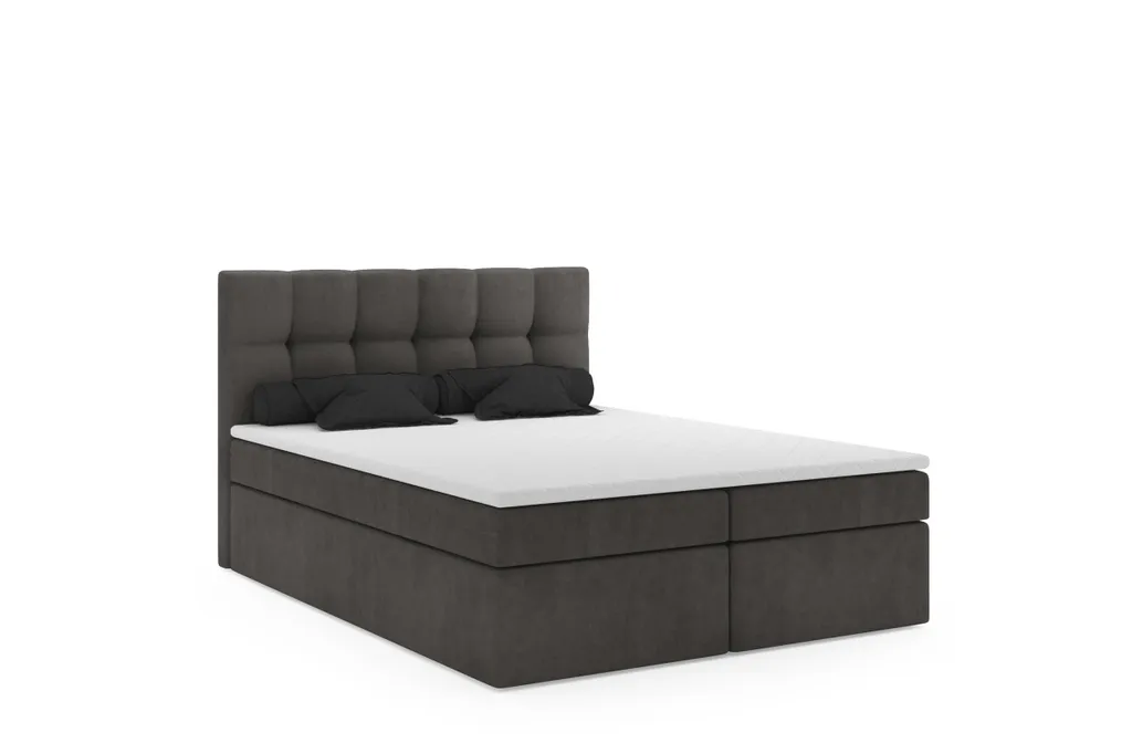 – Bettkasten: Der Bettkasten aus Möbelplatten hat zwei Kästen für Bettwäsche.