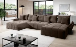 Für mehr Ordnung ist die über Couch mit einem Bettkasten mit Abmessungen von 128 x 70 x 22 cm zur Aufbewahrung von Bettwäsche oder Decken ausgestattet. Mehrere weich gepolsterte große Rücken- und Kopfkissen betonen das kuschelige Erscheinungsbild der U-Couch und erhöhen den Nutzungskomfort. Die Stellfüße aus hartem Kunststoff runden das Gesamtbild ab.