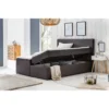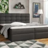 Das elegante Polsterbett ist mit einem Kopfteil und einem Bettkasten ausgestattet. Das hohe Kopfteil verhindert, dass die Kissen auf dem Fußboden herunterfallen und die sich dahinten befindliche Wand keine Schäden oder Kratzern von Kopfkissen oder Schlafkissen trägt.