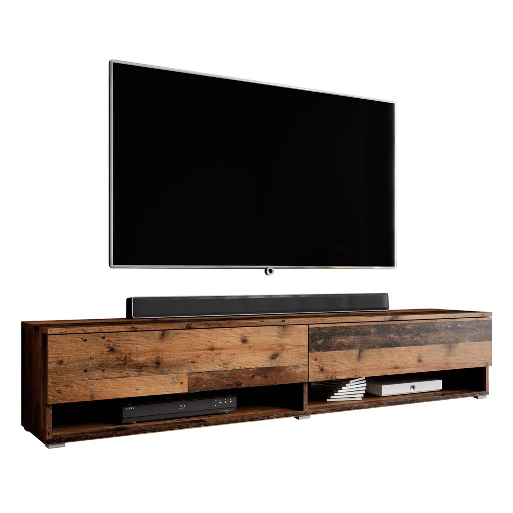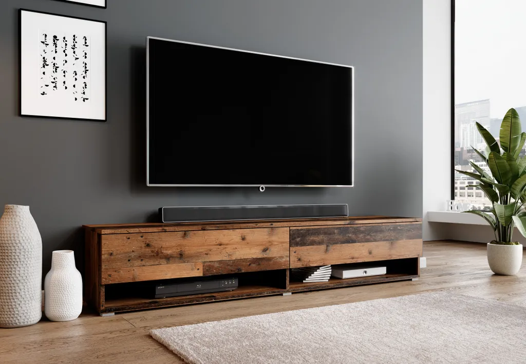 Elegante Optik: Der TV-Schrank mit den Abmessungen B180 x H34 x T32 cm passt perfekt ins Wohnzimmer und bietet eine optimale Stellfläche für TV-Geräte. Das Möbelstück fügt sich in die bestehende Wohnzimmereinrichtung optimal ein.