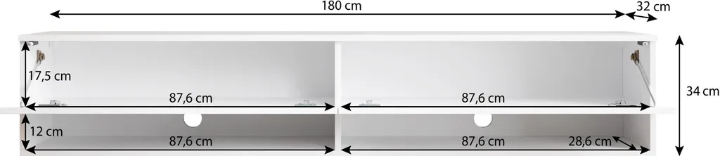 Viel Stauraum: Zwei Ablagen (je B87,6 x H17,5 x T28,6 cm) mit einer „Push-Click“-Tür bieten viel Stauraum für DVDs und Zeitschriften. Die zwei Fächer unten verfügen je über einen Kabeldurchlass und haben je die Maßen B87,6 x H12 x T28,6 cm.