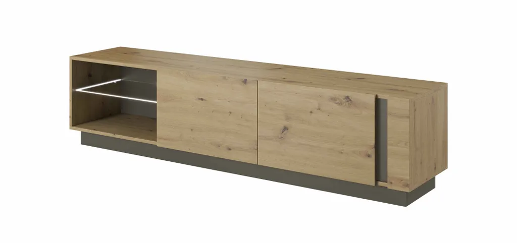 Die 187 cm breite TV-Kommode ist in drei asymmetrische Bereiche unterteilt. Links und mittig befinden Ablagen mit einem modernen Push-to-Open-System.Rechts befindet sich eine offene Ablage mit Glasboden und mit einer Öffnung in der Rückwand. Durch die Öffnung in der Rückwand lassen sich Kabel für Multimediageräte unkompliziert durchziehen.