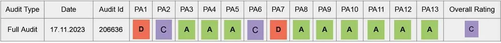 Soziales Managementsystem (Note D), Arbeitnehmerschutz (C), Recht auf Kollektivverhandlungen/Vereinigungsfreiheit (A), Keine Diskriminierung (A), Angemessene Vergütung (A), Angemessene Arbeitszeit (C), Arbeitssicherheit und Gesundheitsschutz (D), Keine Kinderarbeit (A), Arbeitsschutz für Jugendliche (A), Keine Scheinbeschäftigung (A), Zwangsarbeit (A), Umweltschutz (A), Ethisches Geschäftsverhalten (A)