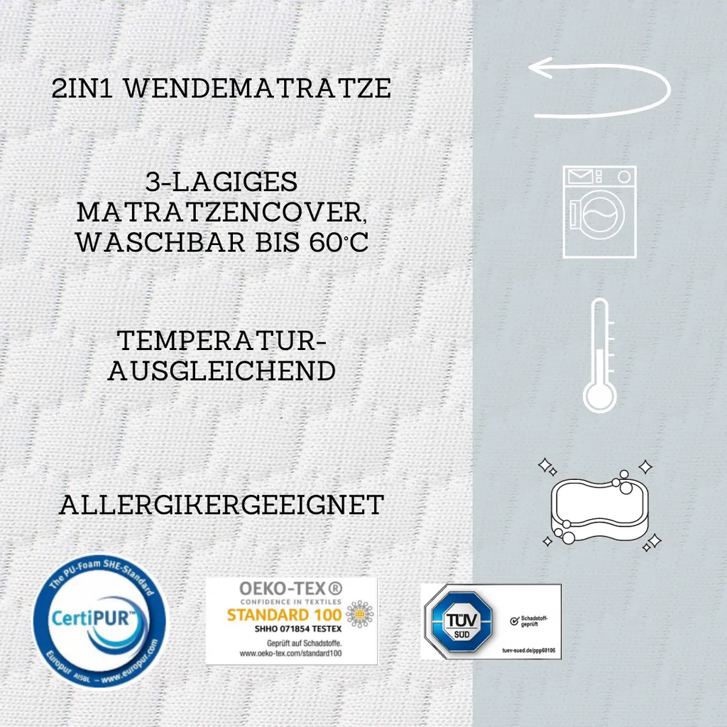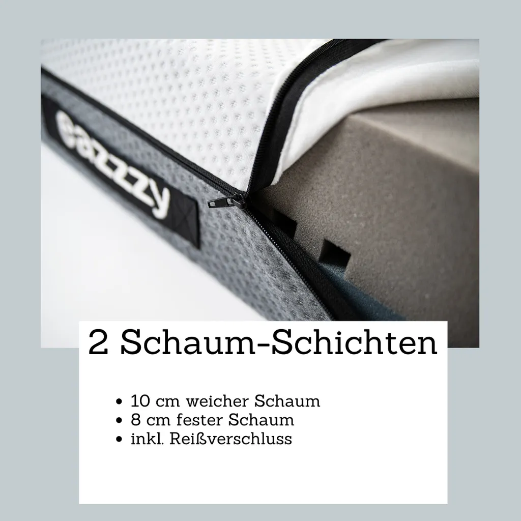 - 2 Schaum-Schichten: 10 cm weicher Schaum, 8 cm fester Schaum