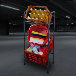 Durch die leichte Neigung der Kästen gelangen Sie schnell und unkompliziert an ihre Vorräte. Unser Kistenregal besteht aus robustem, pulverbeschichtetem Stahlrohr mit rutschfesten Gummifüßen.