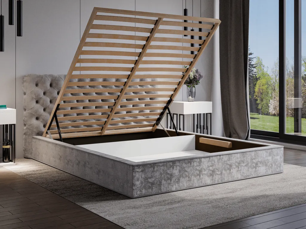 Das Doppelbett Apollo ist ein Modell, das auf großes Interesse stößt. Es ist in den Größen 120 × 200, 140 × 200, 160 × 200, 180 × 200 erhältlich und eignet sich damit sowohl für kleine als auch für geräumige Schlafzimmer. Diese Möbel sind nicht nur schön im Aussehen, sondern auch in großer Funktionalität. Das Glamour Bett Apollo ruht auf einem massiven Holzrahmen mit einem großen Bettkasten darunter.