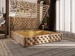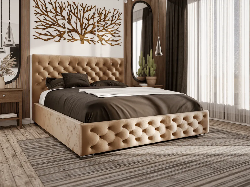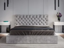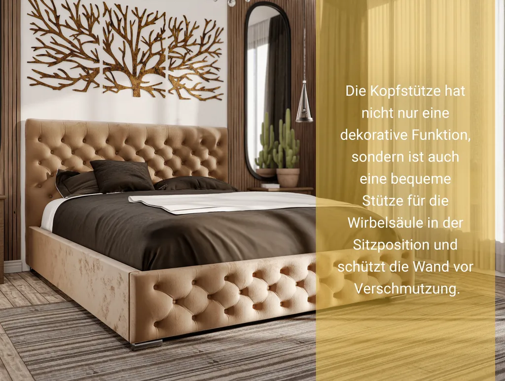 Das Bett Chesterfield Marseille ist die perfekte Wahl für Menschen, die einen eleganten Stil lieben. Es hat ein hohes, gestepptes Kopfteil, das mit hochwertigem Samtvelours bezogen ist. Das Doppelbett Marseille ist vom Barockstil inspiriert und mit zahlreichen Ornamenten und Accessoires versehen. Die tief gesteppten Knöpfe verleihen ihm zusätzliche Eleganz. Die zeitlose Ästhetik bietet unzählige Möglichkeiten für Kombinationen und Zusammenstellungen dieses Bettes mit klassischen Accessoires.