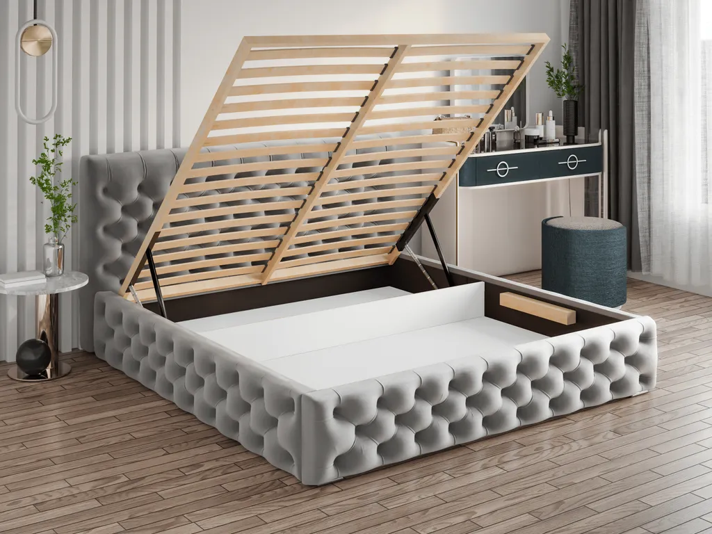 Das Polsterbett Velutto ist ein Modell, das auf großes Interesse stößt. Es ist in den Größen 140 × 200, 160 × 200, 180 × 200 erhältlich und eignet sich damit sowohl für kleine als auch für geräumige Schlafzimmer. Diese Möbel sind nicht nur schön im Aussehen, sondern auch in großer Funktionalität. Das Samtbett Velutto ruht auf einem massiven Holzrahmen mit einem großen Bettkasten darunter.