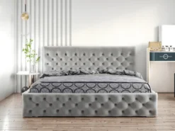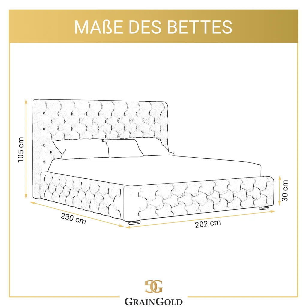 Das Chesterfield Bett Velutto ist die perfekte Wahl für Menschen, die einen eleganten Stil lieben. Es hat ein hohes, gestepptes Kopfteil, das mit hochwertigem Samtvelours bezogen ist. Das Doppelbett Velutto ist vom Barockstil inspiriert und mit zahlreichen Ornamenten und Accessoires versehen. Die tief gesteppten Knöpfe verleihen ihm zusätzliche Eleganz. Die zeitlose Ästhetik bietet unzählige Möglichkeiten für Kombinationen und Zusammenstellungen dieses Bettes mit klassischen Accessoires.