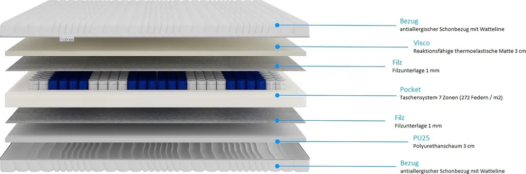 Taschenfederkernmatratzen sind eine Weiterentwicklung der uns seit Jahren bekannten Federkernmatratzen, die darin besteht, die Federn zu verkleinern und in separate Taschen mit Schaumstoffeinlage zu legen. Die Anzahl der Federn ist direkt proportional zur Stützkraft – ihre entsprechende Anzahl sorgt für die richtige Härte der Matratze. Doch damit nicht genug – Taschenfederkernmatratze haben noch einen weiteren Vorteil, nämlich einen leisen Betrieb und eine ausreichende Luftzirkulation – bei gleichzeitiger Erhöhung des Hygienekomforts. Die Neno Federkernmatratze ermöglicht es Ihnen, während des Schlafes eine gute Körperhaltung beizubehalten.