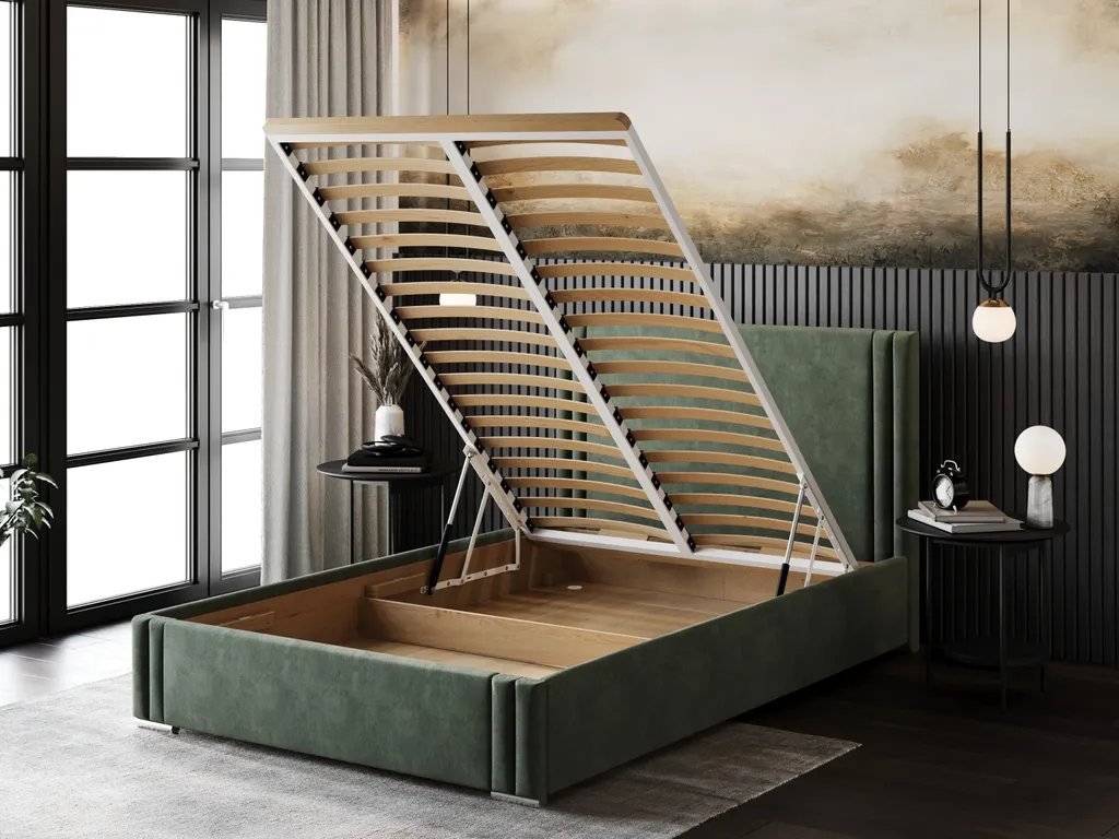 Das Polsterbett Feel ruht auf einem massiven Holzrahmen mit einem großen Bettkasten darunter.