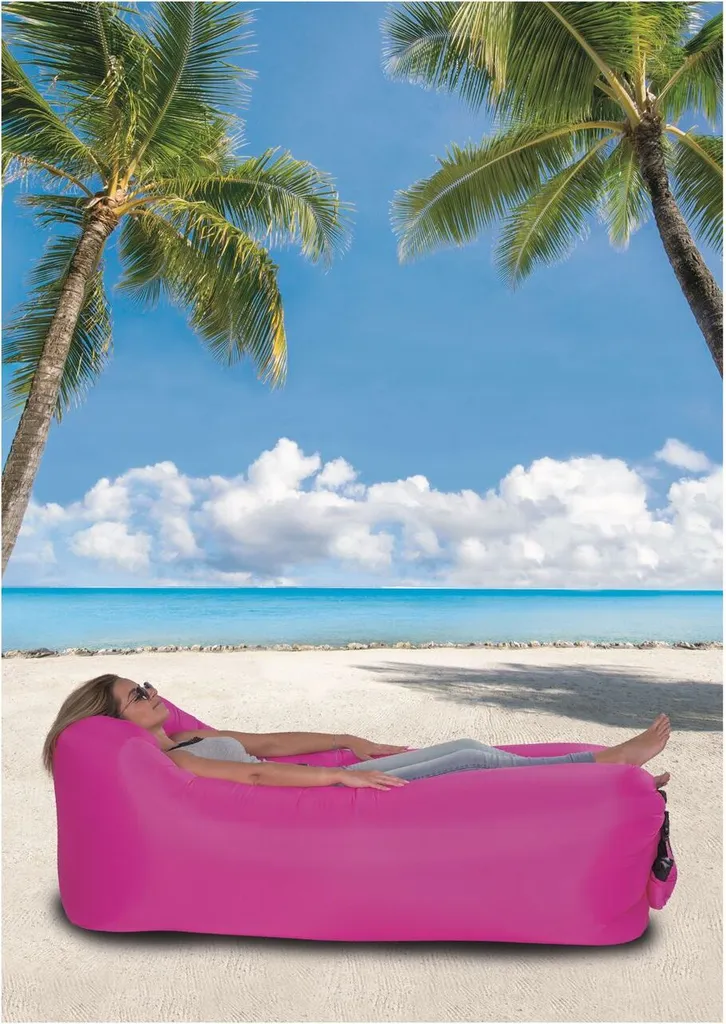 Am Strand, im Garten oder im Vorzelt – mit ein wenig Übung lässt sich der Lounger in wenigen Sekunden mit Luft befüllen: Er wird bei geöffneter Schmalseite durch die Luft gezogen und verschlossen; Maße L 180 × B 75 × H 60 cm.
