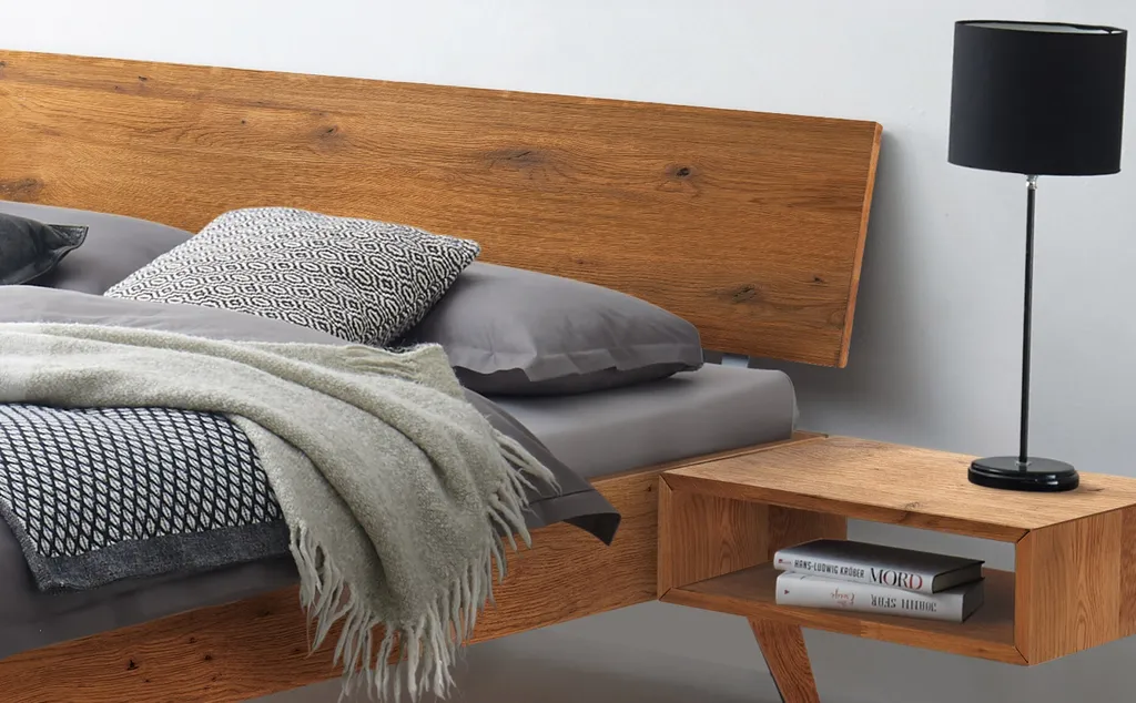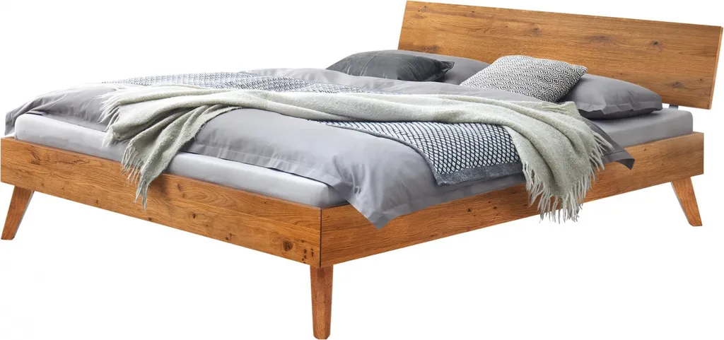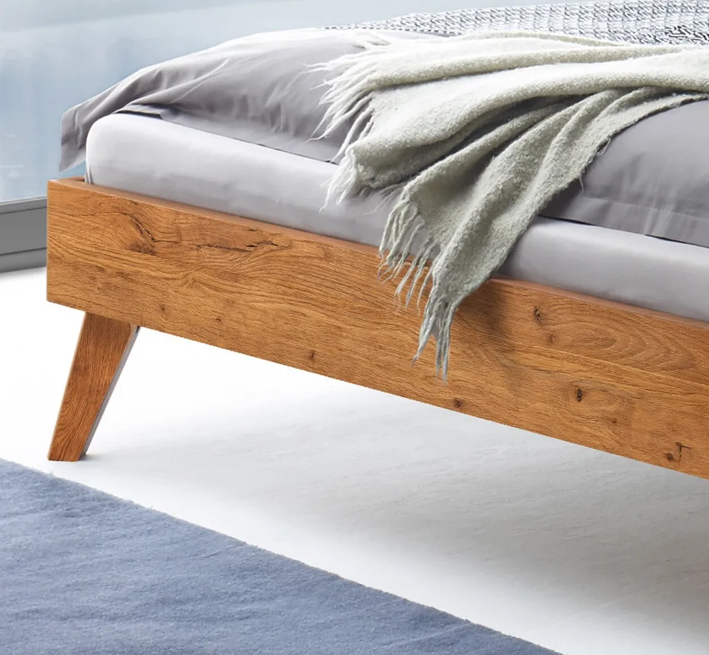 Das zeitlos moderne Hasena Trento Bett Ancona 25 in Komforthöhe aus massivem Wildeichenholz bringt ein Stück natur in Ihr Schlafzimmer. Komplett mit 25 cm hohen und elegant schlanken Füßen in Komforthöhe für eine angenehm komfortable Sitzhöhe, sowie einem durchgehenden Kopfteil. Der 16 cm hohe Bettrahmen ist ideal auch für höhere Matratzen und Lattenroste geeignet. Die filigranen und leicht schräg verlaufenden Füße schaffen eine optische Leichtigkeit und sorgen für ein luftiges Raumgefühl in Ihrem Schlafzimmer.