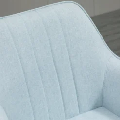Der Stuhl ist mit einer gepolsterten Sitzfläche, Rückenlehne und Armlehnen ausgestattet und mit einem bequemen und atmungsaktiven Leinenstoff bezogen. Die ergonomisch geschwungene Rückenlehne sorgt für eine entspannte und bequeme Körperhaltung