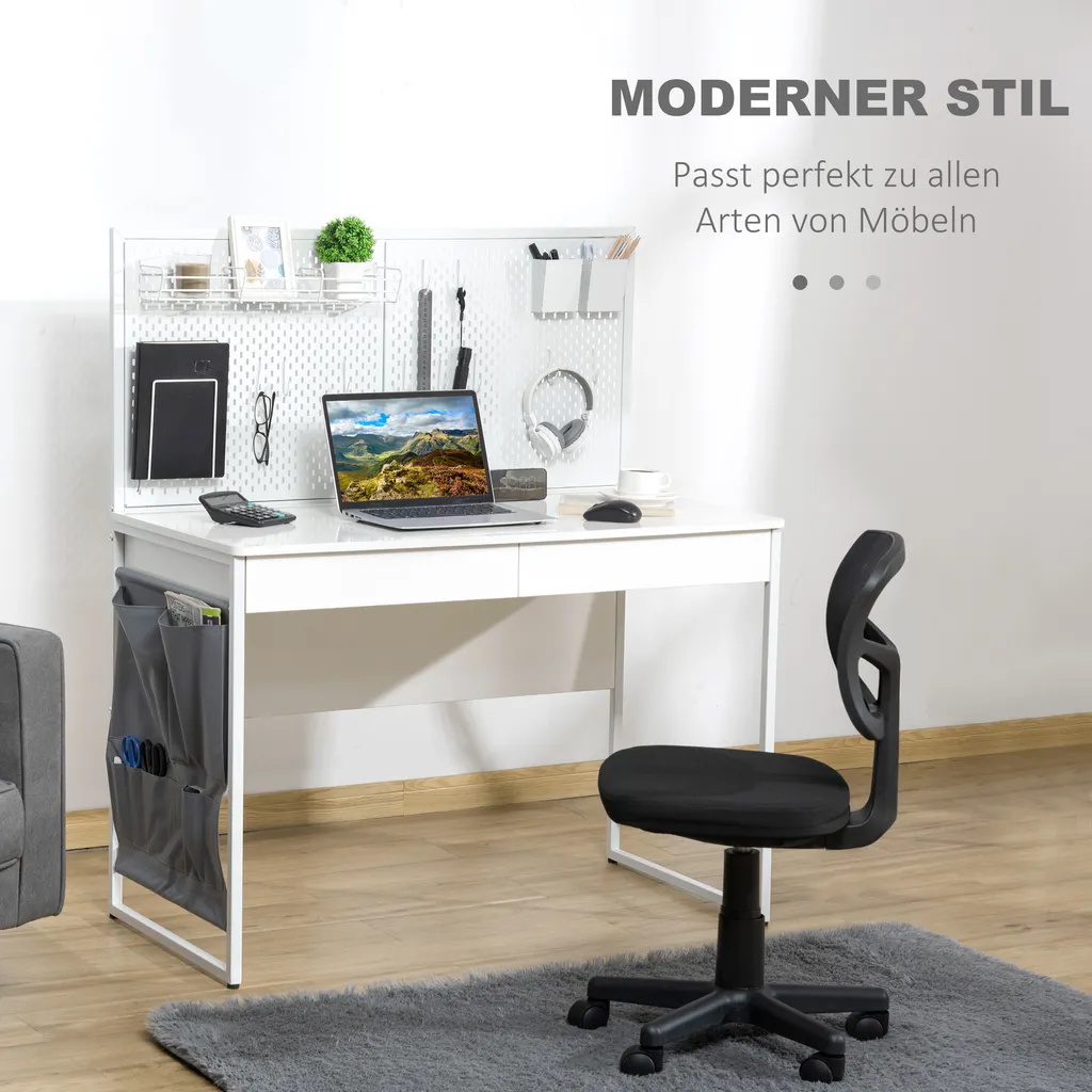 Dieser Schreibtisch kommt mit einem praktischen Notizgitter inklusive 10 Haken an der Notizen, Dekorationen, Aufbewahrungsboxen und ein Stifthalter befestigt werden können.