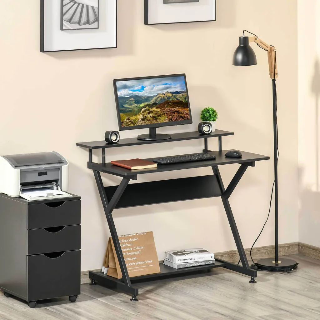 Dieser Computertisch mit Stauraum verfügt über eine obere Monitoranlage und eine untere Ablage, in der Sie Ihre Bücher, Pflanzen und andere Dinge des täglichen Bedarfs unterbringen können