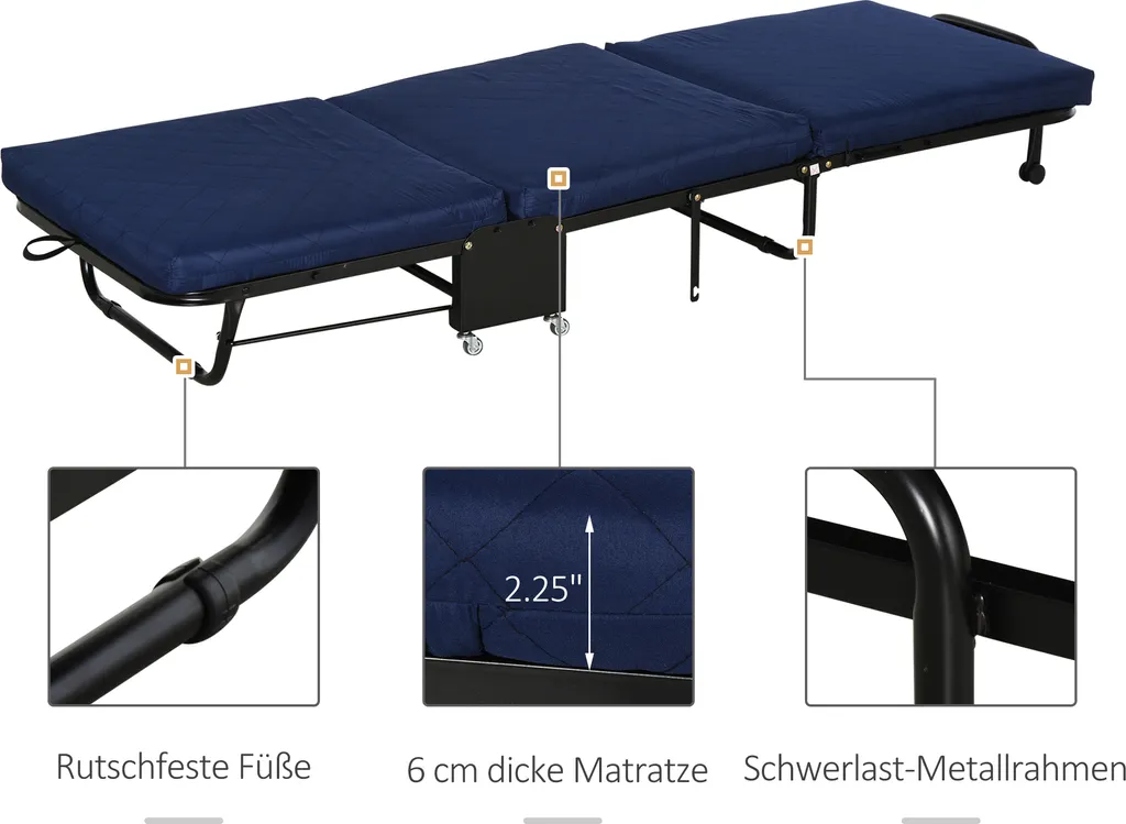 Dieses HOMCOM-Faltbett überwindet die Unzulänglichkeiten traditioneller Matratzen, die groß und nicht leicht zu lagern sind. Wenn es nicht wird, lässt es sich leicht zusammenklappen und platzsparend in der Ecke Ihres Zimmers aufstellen. Wenn ein Gast zu Ihnen nach Hause kommt, nehmen Sie es einfach heraus, es wird ein ideales Zusatzbett sein.