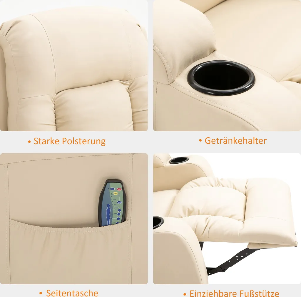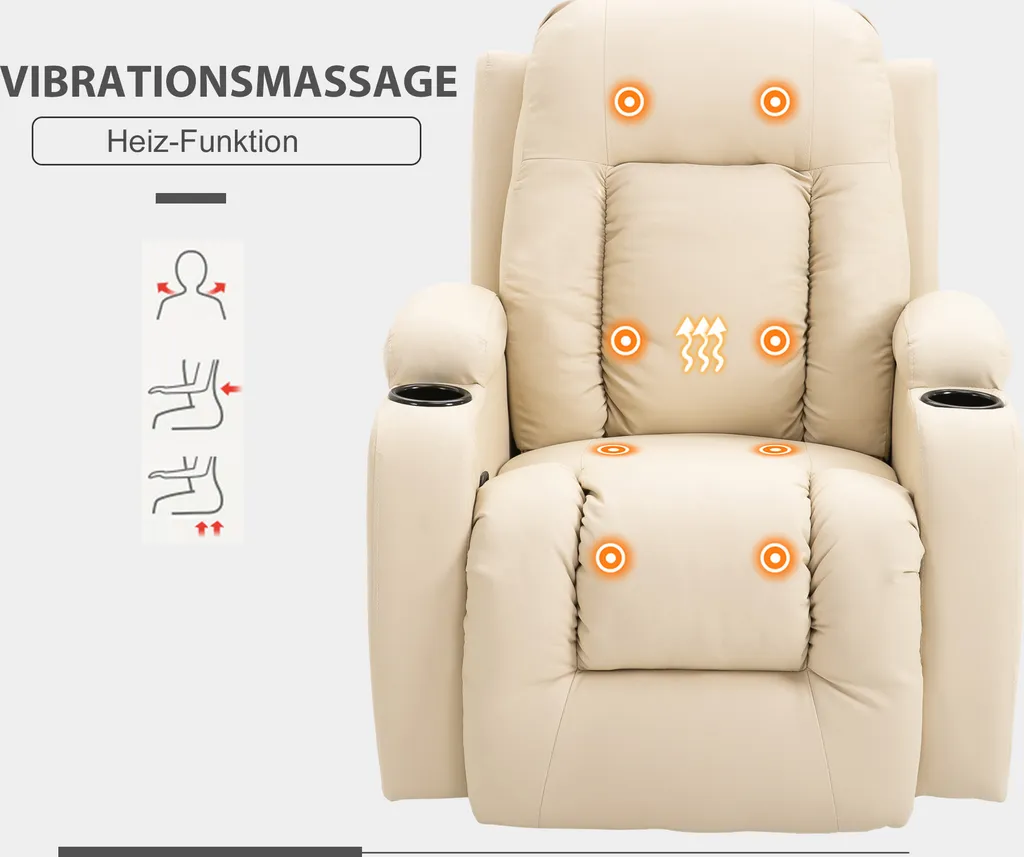 Dieser Massagesessel von HOMCOM wird durch seine großzügige Polsterung zum Wohlfühlsessel. Die Polsterung schmiegt sich dem Körper optimal an und ist zudem besonders langlebig. Das Obermaterial besteht aus hochwertigem Kunstleder, welches sehr pflegeleicht ist. Der besondere Clou- die Getränkehalter sind in den Armlehnen eingebaut. Für den ultimativen Entspannungsfaktor sorgt eine integrierte Wippfunktion.