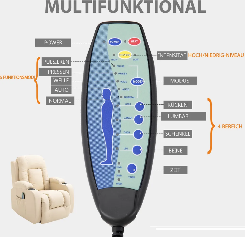 – Massage: 8 Vibrationsmassagepunkte für Rücken, Taille, Oberschenkel und Unterschenkel