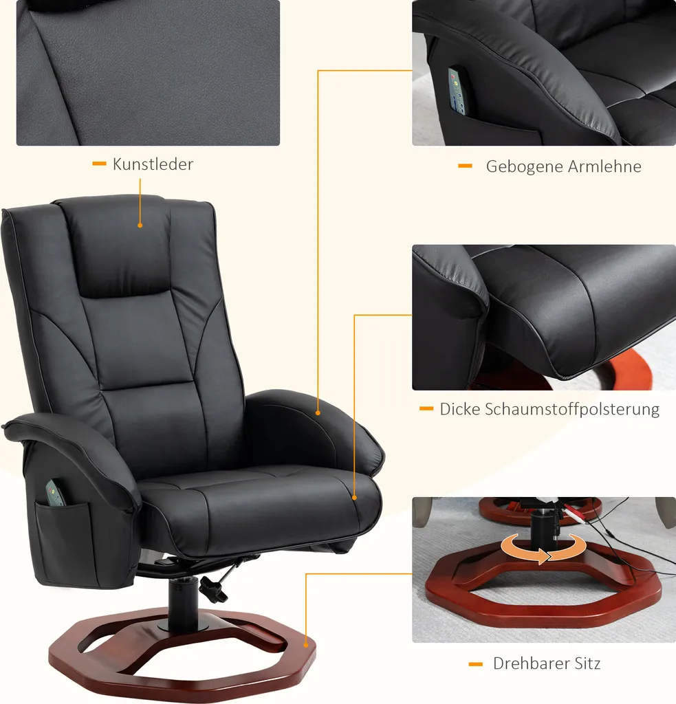 Dieser moderne Massagesessel ist mit seiner glatten Kunstlederoberfläche und dem runden Holzsockel wunderschön gestaltet, ohne den Komfort zu beeinträchtigen. Es ist ideal für eine angenehme Auszeit, egal ob Sie fernsehen, ein Buch lesen oder sich ausruhen.