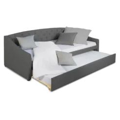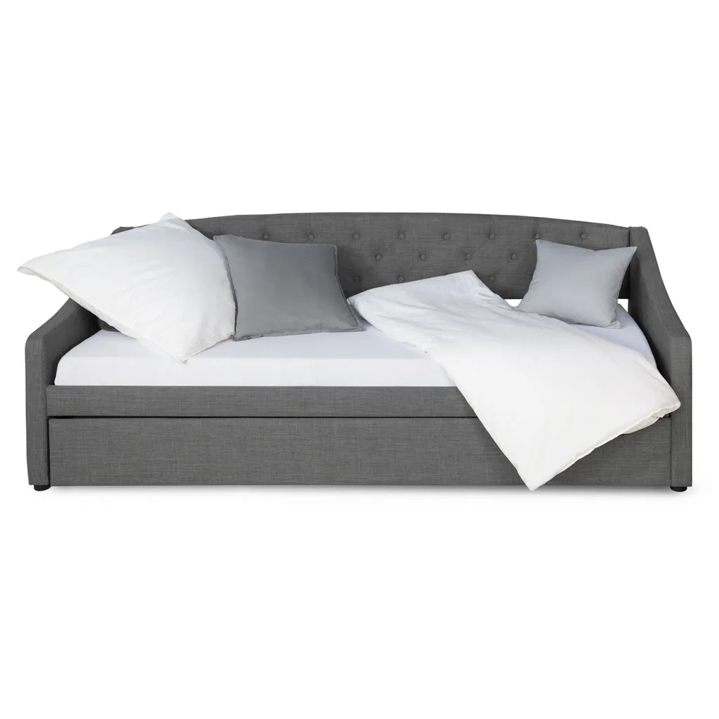 Praktisch, funktional und stilvoll. Das graue Tagesbett mit bequemen Polsterbezug ist ideal für das Gästezimmer oder Jugendzimmer geeignet. Durch die Ausziehfunktion kann auch spontaner Übernachtungsbesuch leicht untergebracht werden. Die zwei Liegeflächen ermöglichen ein gemütliches Beisammensein. Ebenfalls kann das Polsterbett mit großen Kissen in eine wohnliche Couch umgewandelt werden. Das graue Funktionsbett mit einer Liegefläche von 90×200 cm wird mit einem passenden Lattenrollrost verschickt. Die Rückenlehne ist mit abgesteppten Knöpfen versehen und verleiht dem Schlafsofa eine besondere Note.