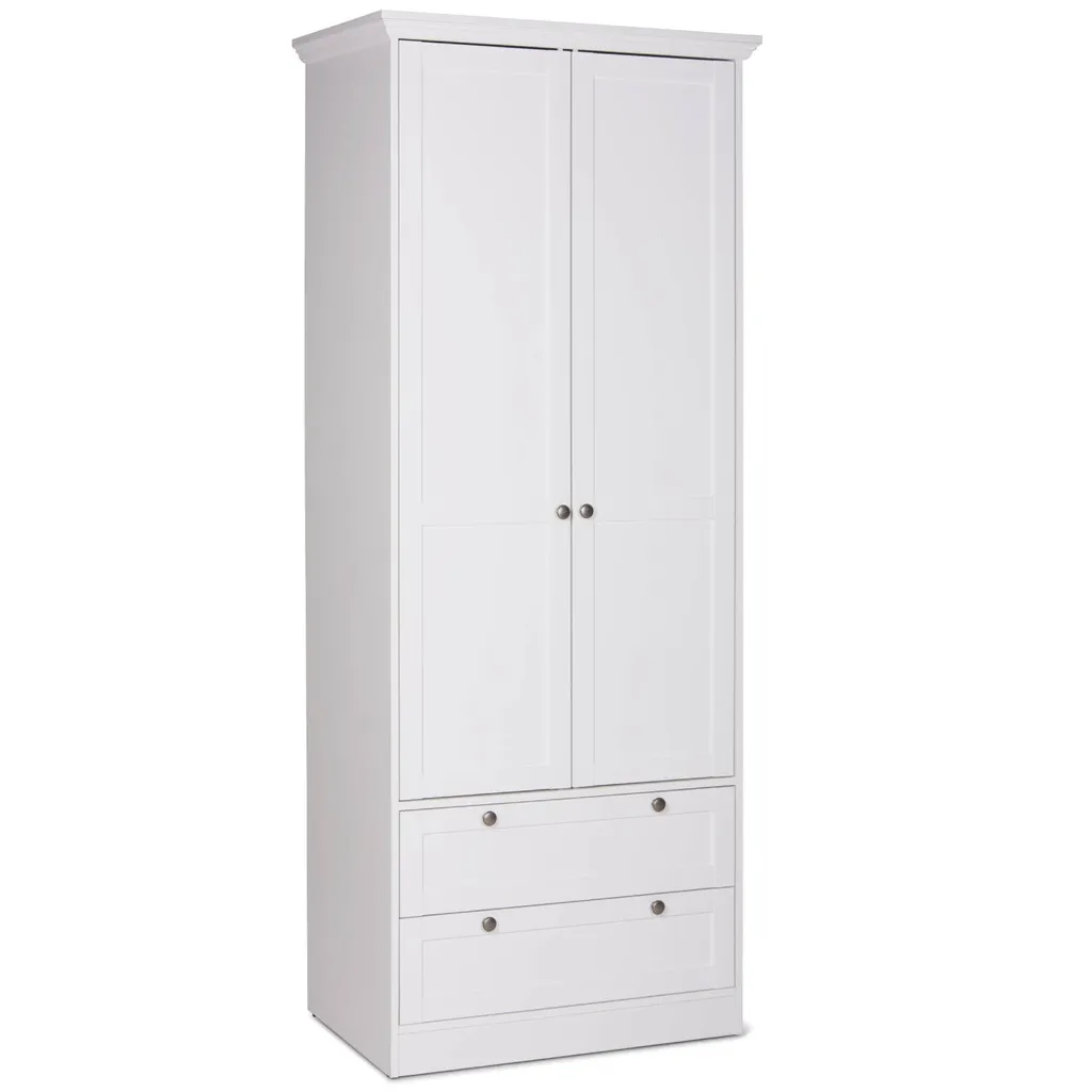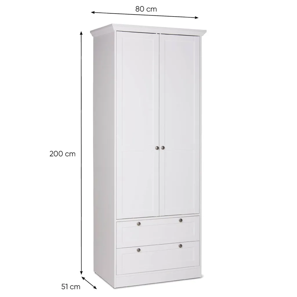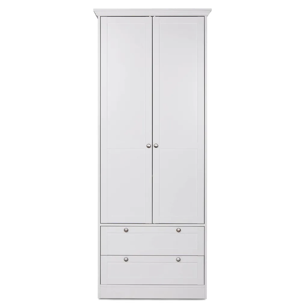 Platzwunder im zeitlosen Landhausstil! Unser moderner Kleiderschrank überzeugt durch sein helles und freundliches Design und schafft ein angenehmes und wohnliches Flair in jedem Wohnraum. Der weiße Drehtürenschrank verfügt über 2 praktische ausziehbare Schubläden und 2 Schränktüren. Im Innenraum überzeugt ein großes Fach mit Einlegeboden und eine Metallkleiderstange für eine durchdachte Aufteilung. Der Schrank in elegantem Weiß eignet sich als nützliches Ordnungssystem mit mehreren Unterbringungsmöglichkeiten für Jacken, Kleider, Pullover, T-Shirts und Hosen. Ob im Jugend-, Schlaf-, Gästezimmer oder als Garderobe im Flur, der massive Kleiderschrank passt durch sein dezentes Design in jedem Raum und zu diversen anderen Möbeln. Schlichte silberne Griffe heben den Schlafzimmerschrank im skandinavischen Look stilvoll ab.