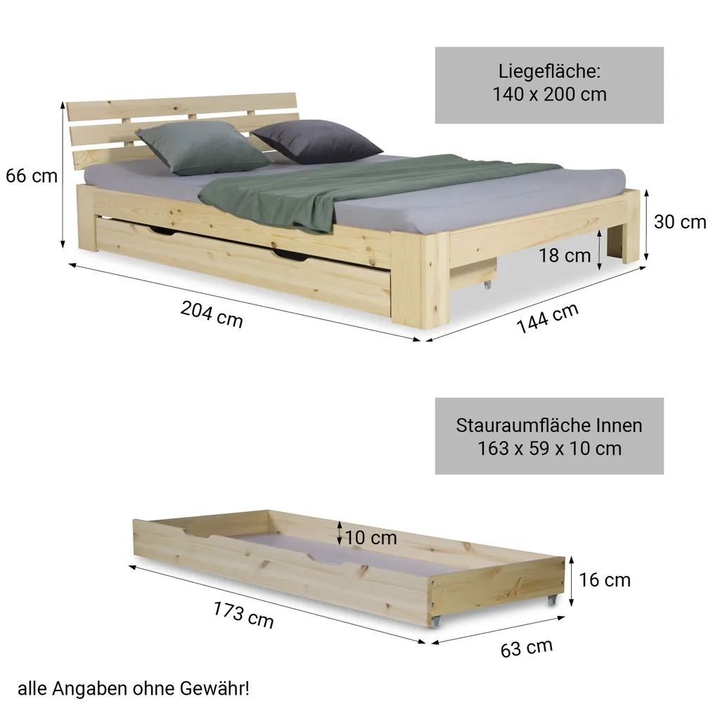 Das Bett lässt sich aufgrund seines dezenten Designs perfekt in jeden Schlafraum, Gästezimmer oder Jugendzimmer integrieren. Das Bettgestell samt Kopfteil ist aus massiver Kiefer natürlich klar lackiert. Passend zum Bettgestell gibt es einen großen ausziehbaren Schubkasten und Lattenrost passend dazu.