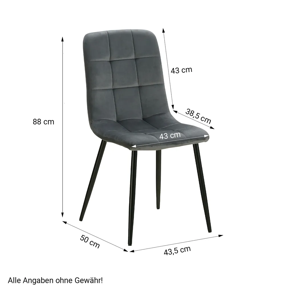 Nehmen Sie Platz auf unseren bequemen Esszimmerstühlen und genießen Sie Speisen und Getränke im Kreise Ihrer Liebsten. Die modernen Küchenstühle sind die perfekte Ergänzung zu unseren Esstischen. Sitz und Rückenlehne sind mit edlem grauen Samt bezogen und sorgen für eine stets komfortable Sitzgelegenheit. Massive Metallfüße aus schwarz beschichtetem Stahl verleihen den Polsterstühlen einen stabilen und sicheren Stand. Die Stühle lassen sich vielseitig kombinieren und passen durch ihre moderne, dezente Form sowohl ins Esszimmer, Küche, Wohnzimmer, als auch Arbeitszimmer.